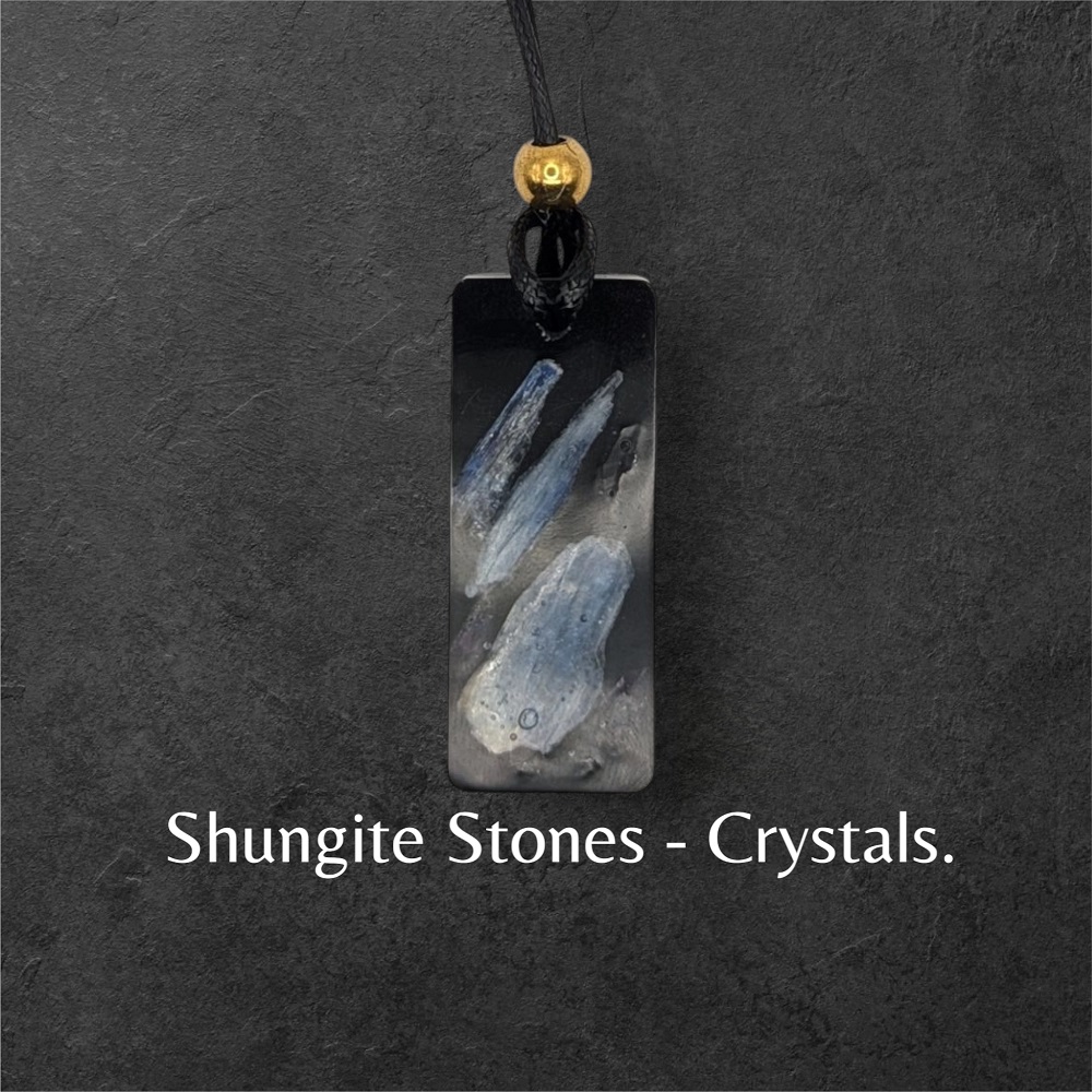 Shungite Plus Stones/Crystals: A striking contrast of deep black Shungite interspersed with shimmering Blue Kyanite blades, Amethyst Crystals chips, Selenite and Quartz, creating a captivating visual depth.