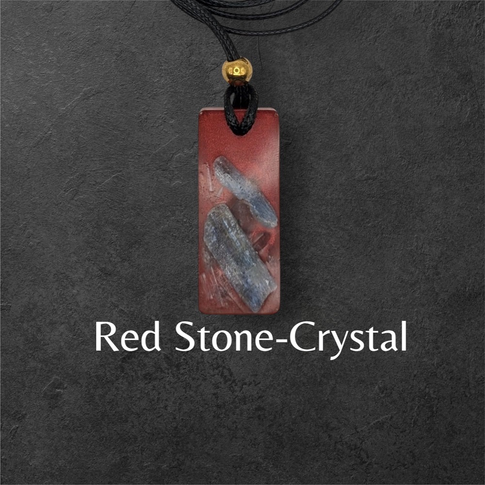 Red Plus Stones/Crystals: A vibrant Red Colored pendant adorned with striking blue kyanite inclusions, Amethyst, Selenite and Quartz offering a bold and energetic look.