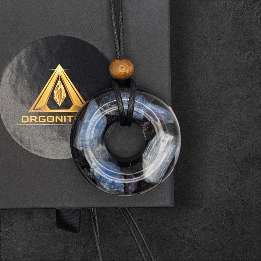 Made from high-quality resin and featuring a stunning blue Kyanite, Amethyst, SHUNGITE Powder, Selenite and Quartz, this pendant is sure to impress.